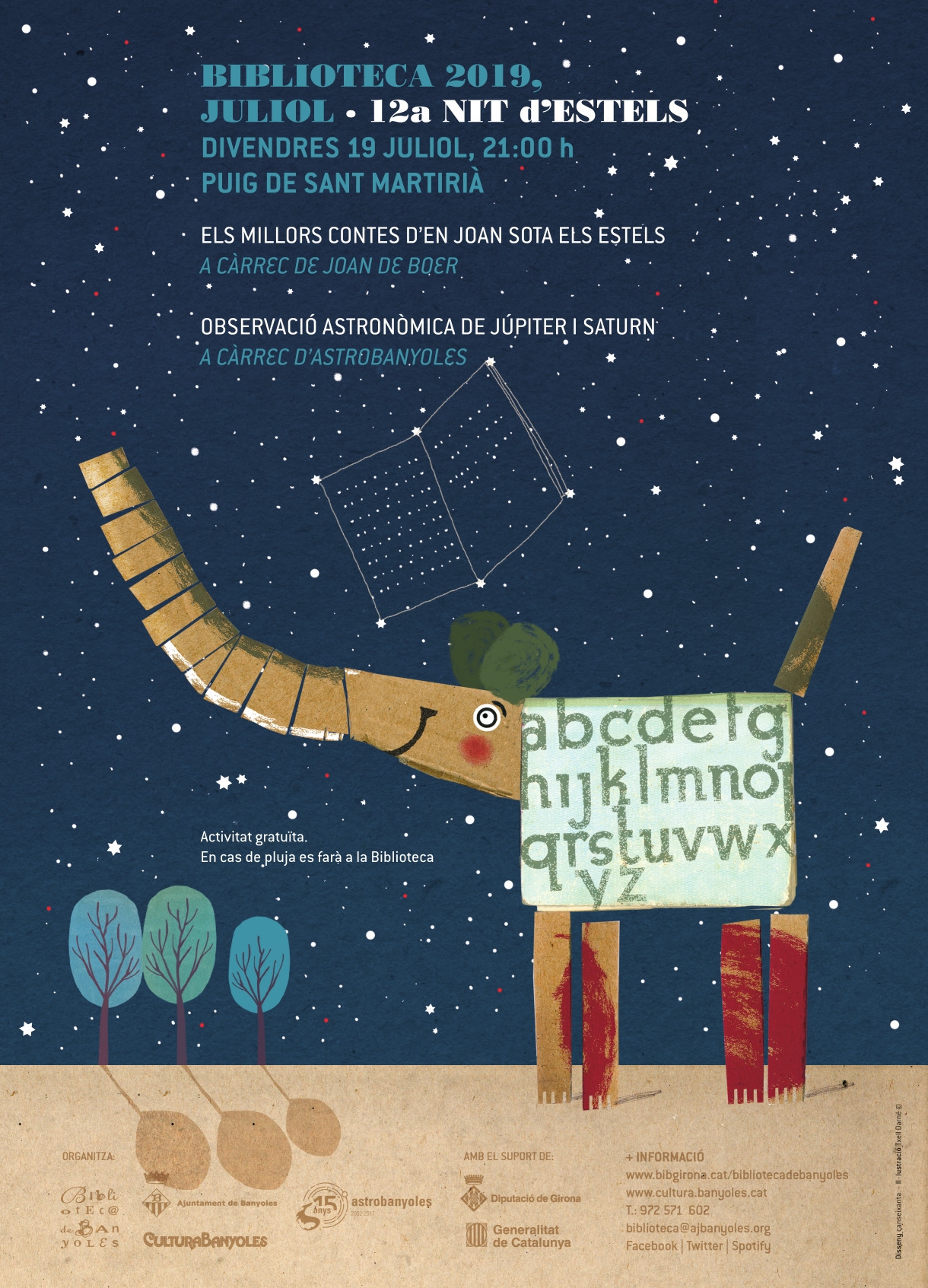 La Biblioteca conjuntament amb Astrobanyoles organitza, com cada any, aquesta activitat astronòmica i literària. Enguany celebrarem el 50 aniversari de l’arribada de l’home a la lluna i podrem contemplar la lluna i els satèl·lits Saturn i Júpiter.